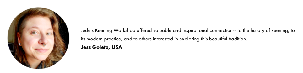 Keening is a centuries old ritual of lamenting the dead, stretching back to pre-christian times. Keening was the role of the Bean Chaointe, the Keening Woman, who led the community through their grief as well as singing the soul back home to the Otherworld.